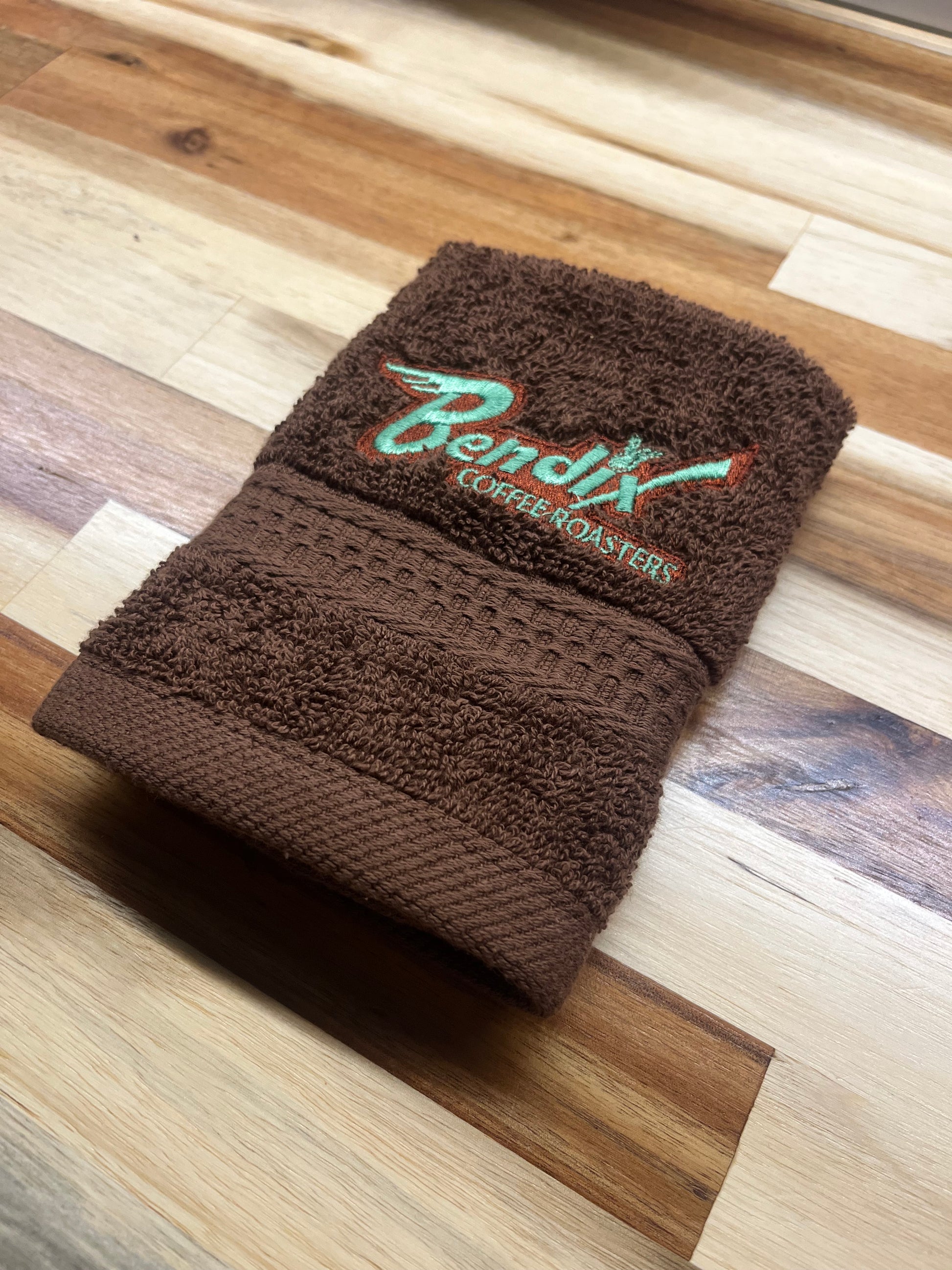 Elevate your coffee bar with the Coffee Bar Towel - Bendix Branded. Crafted in a rich brown espresso color, this embroidered logo towel combines style and function, making it the perfect stationary towel for your coffee setup. Durable and absorbent, it keeps your space clean while showcasing your passion for quality coffee. Add a touch of professionalism and warmth to every pour with this essential coffee bar accessory.